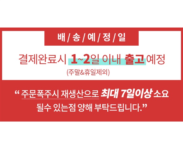 · 배송은 입금확인된 날짜로부터 1~3일 소요되며 최대 7일 이내 출고됩니다. (공휴일, 기상악화 등 불가피한 상황에 따라 추가 지연될 수 있습니다.)